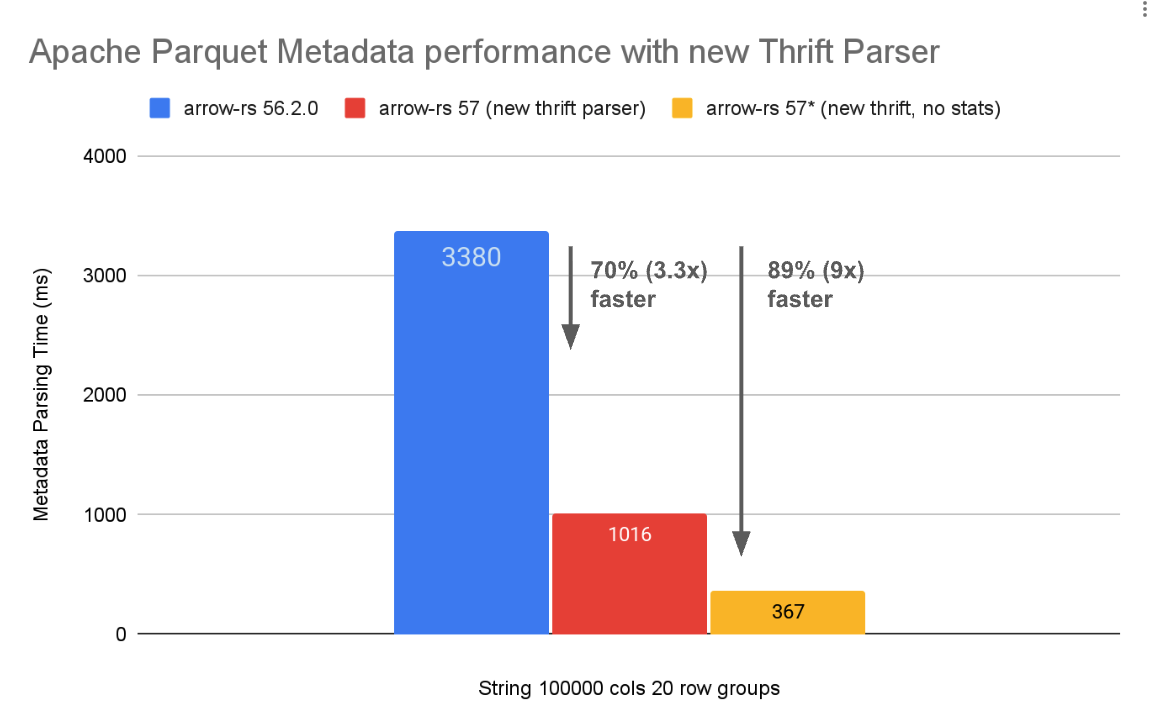 Version 57.0.0 of the parquet Rust crate decodes metadata more than three times faster than previous versions thanks to a new custom Apache Thrift parser. The new parser is both faster in all cases and enables further performance improvements not possible with generated parsers, such as skipping unnecessary fields and selective parsing.