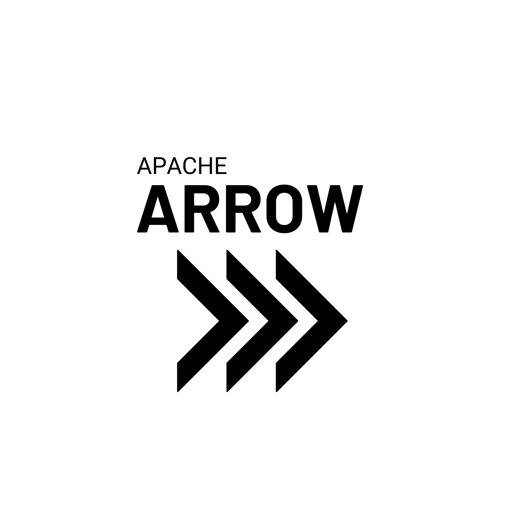 The Apache Arrow logo consists of the "Apache Arrow" logotype and the "Triple Chevron" logomark, arranged horizontally with the text placed to the left of the image. The standard "light theme" version of the logo uses black text and image against a white background, and the standard "dark theme" version of the logo is white against a black background. The light version looks like this: