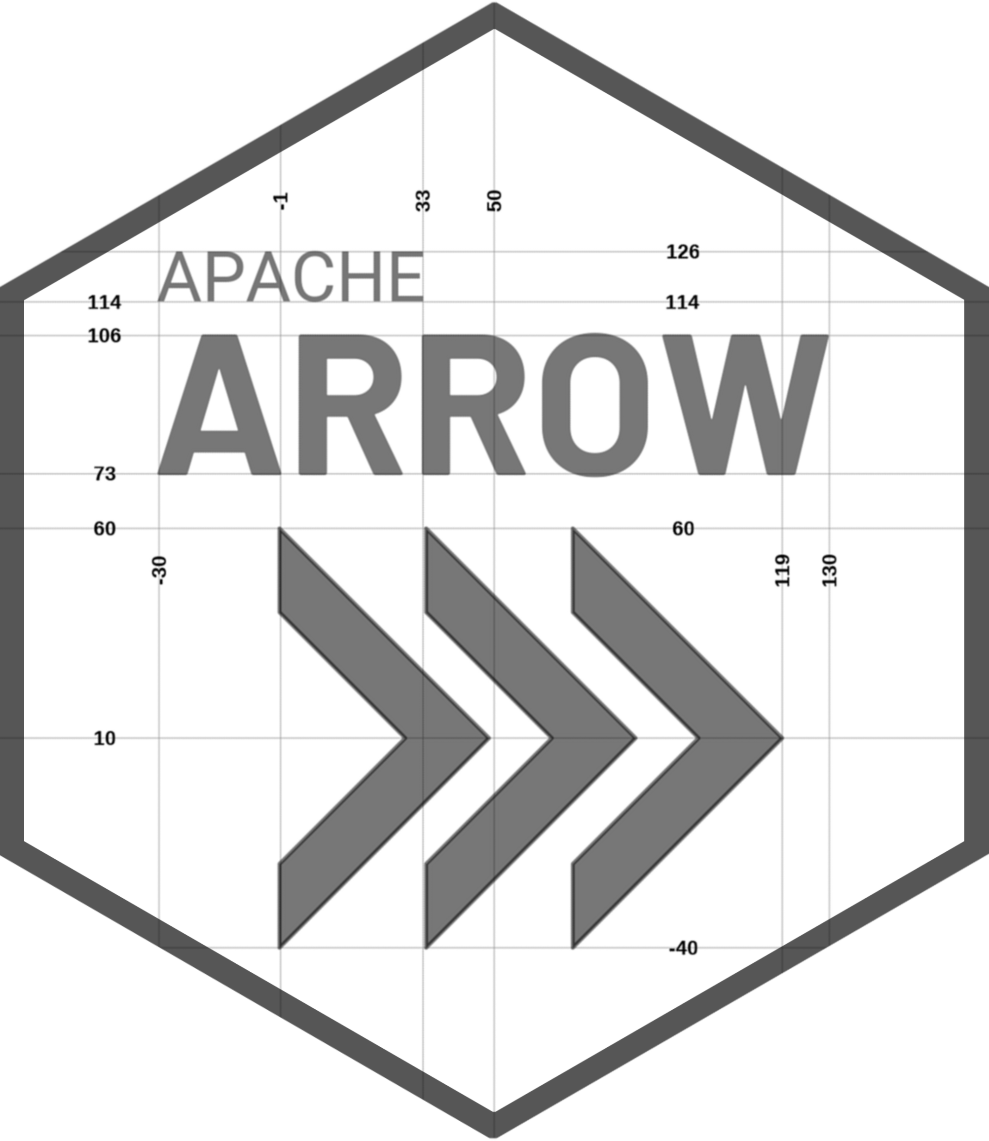 The annotated image below shows the precise spacing used in the horizontal version of the Apache Arrow logo as well as the design of the Triple Chevron. Each chevron has width exactly half its height, and forms a 90-degree angle at the tip. The thickness (both vertically and horizontally) of the chevron is 20% of its height. The spacing between adjacent chevrons is 15% of the height (i.e., if height = 100, width = 50, and spacing = 15).
