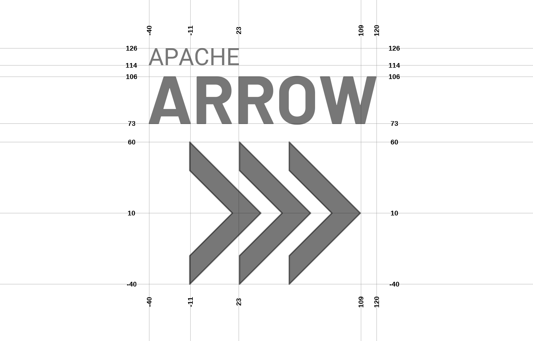 The horizontal midline of the word "Arrow" is aligned with horizontal midline of the chevrons, and the height of the word "Arrow" is approximately 1/3 the total height of the chevrons. Similarly the midline of the word "Apache" is aligned with the upper-inner vertex of the chevrons. The logotype and logomark are placed flush against one another, with the rightmost tip of the "W" in "Arrow" vertically aligned with the leftmost edge of the chevrons.