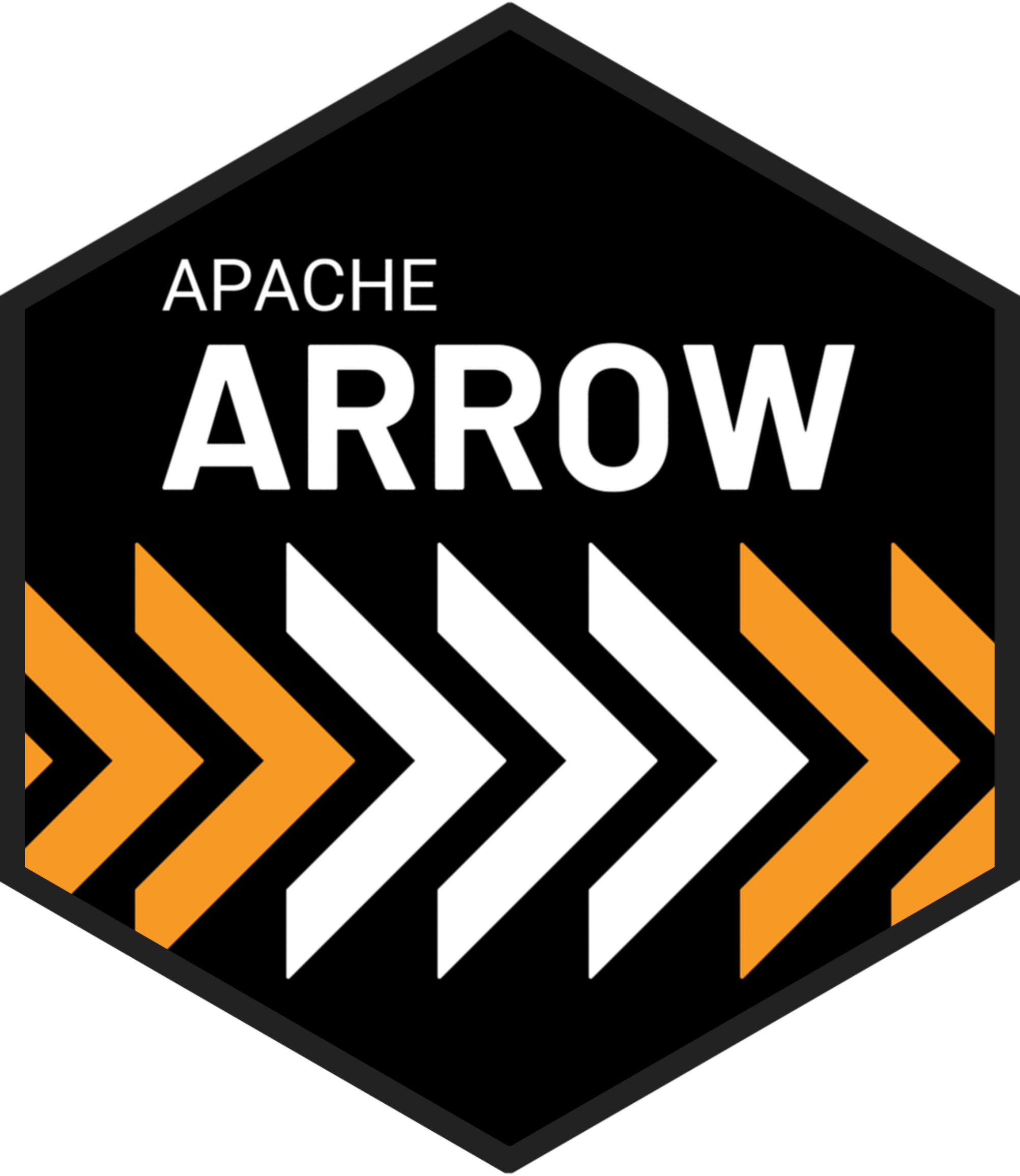 The image on the right adds extra orange colored chevrons to the dark themed hex sticker. Again, this is clearly not part of the official Apache Arrow visual identity and should not be presented as such. For this to be appropriate, even informally, the context would need to be one in which the orange elements are meaningfully connected to the surrounding imagery (e.g., perhaps the orange chevrons continue horizontally in either direction) so that the core of the Apache Arrow logo itself remains visually coherent.